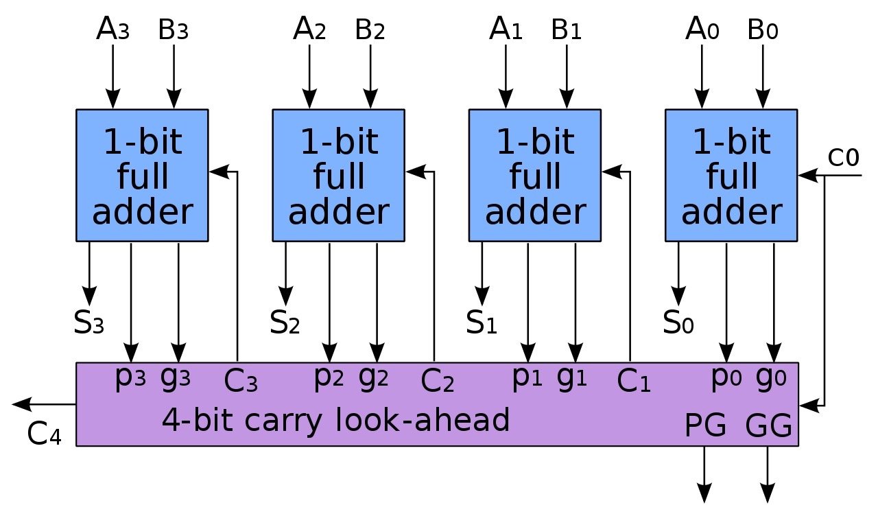 要想理解 CLA(Carry-Lookahead Adder,超前进位加法器)的原理,首先要知道两个概念:生成(generate) 和 传播(propagate)。假设 A 和 B 是两个加数,$A_i$ 和 $B_i$ 分别代表 A 和 B 从右边数第 i 位上的数,i 从 0 开始计数,$C_i$ 代表第 i-1 位产生的进位,$C_0=0$ 。生成指的是无论右边有没有进位,当前位上都会产生进位,比如二进制的 10 + 10,个位上相加得 0,二位(类似于十进制的十位)上相加得 0,产生进位 1,于是我们说二位上是生成的,我们用 $G_i$ 表示第 i 位是否生成,其实可以看出来,只有当 $A_i$ 和 $B_i$ 同时为 1 时,第 i 位才生成,所以 $G_i = A_i \cdot B_i$($A_i \cdot B_i$ 表示 $A_i$ 和 $B_i$ 做「与」操作);传播指的是由于右边有进位,导致当前位相加时产生了进位,比如二进制的 101 + 111,本来二位上 0 + 1 没有产生进位,但是由于个位上两个 1 相加产生了进位,导致现在二位上其实是 0 + 1 + 1,由此产生了进位,这种情况我们称之为传播,用 $P_i$ 表示第 i 位是否传播,不难发现,$A_i$ 和 $B_i$ 只要有一个为 1,第 i 位就会传播,所以 $P_i=A_i + B_i$($A_i + B_i$ 表示 $A_i$ 和 $B_i$ 做「或」操作)。