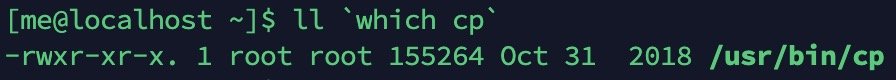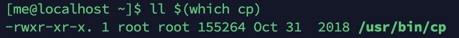 在 shell 中可以将命令 A 的输出作为命令 B 的参数,命令 A 需要放到「$()」的括号内,比如这条命令:ll $(which cp),将命令 which cp 的输出作为参数传递给了 ll 命令,这样我们就可以得到 cp 这个程序的相关信息,而不用关心 cp 程序的文件到底放在哪个目录下。执行效果如图一所示。