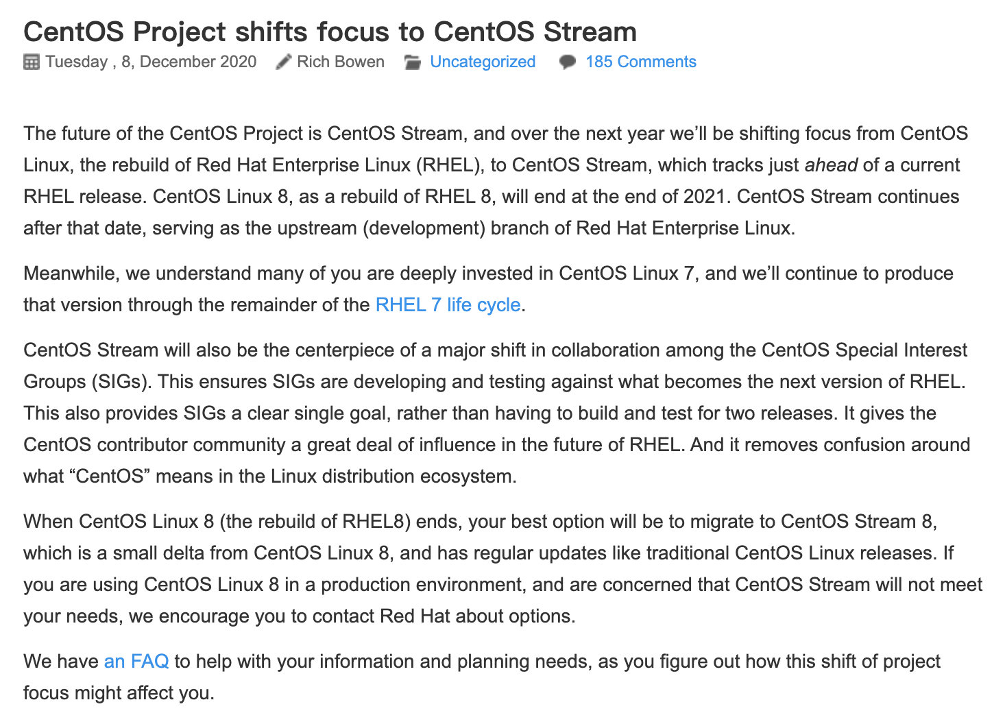 CentOS 项目宣布,CentOS 8 将于 2021 年底结束,而 CentOS 7 也将在 RHEL 7 的生命周期结束后停止维护。未来一年 CentOS 将把重心放到 CentOS Stream 上,CentOS Stream 即 CentOS 滚动版,是 RHEL 的上游项目,会定期发布新的版本,在 CentOS Stream 中经过验证和测试后没问题的功能会应用在 RHEL 中。CentOS 建议目前使用 CentOS 8 的用户迁移到 CentOS Stream 上,但由于 CentOS Stream 不稳定,所以不建议将其用在生产环境中。