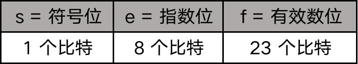 IEEE-754 标准中定义了计算机如何用 32 个比特位存储一个浮点数:从左边起,第 1 位是符号位,用 s 表示,s=0 表示正数,s=1 表示负数;第 2 位到第 9 位是指数位,用 e 表示;第 10 位到第 32 位是有效数位,用 f 表示。知道了s、e、f,根据下面的公式,就可以算出浮点数的值: