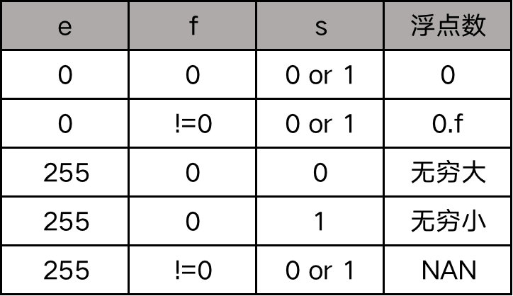 上面这个公式是没法表示 0 的,所以 IEEE 规定,当 e = 0 且 f = 0 时,就认为这个浮点数是 0。还有其他一些特殊情况,见下表:
