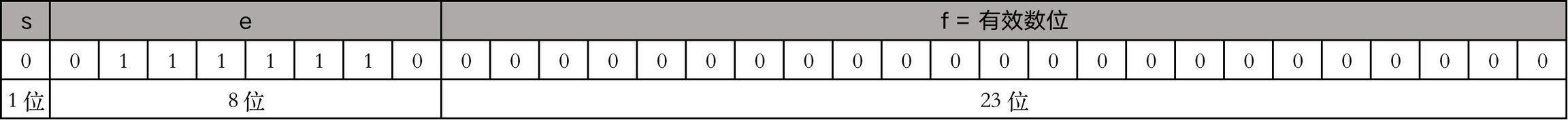 s = 0,e = 126,所以 e - 127 = -1,f = 0,所以它表示的二进制浮点数是: (−1)0×1.0×2−1=0.1 ,十进制就是 (−1)0×1.0×21=0.5 (十进制中 2−1=21 )