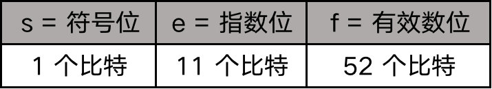 这种用 32 个比特位表示的浮点数我们称之为单精度浮点数,即 float,还有一种用 64 个比特位表示的浮点数,我们称之为双精度浮点数,即 double。double 的指数位长度是 11,有效数位长度是 52,所以 double 能够表示的数的范围更广,精度更高。
